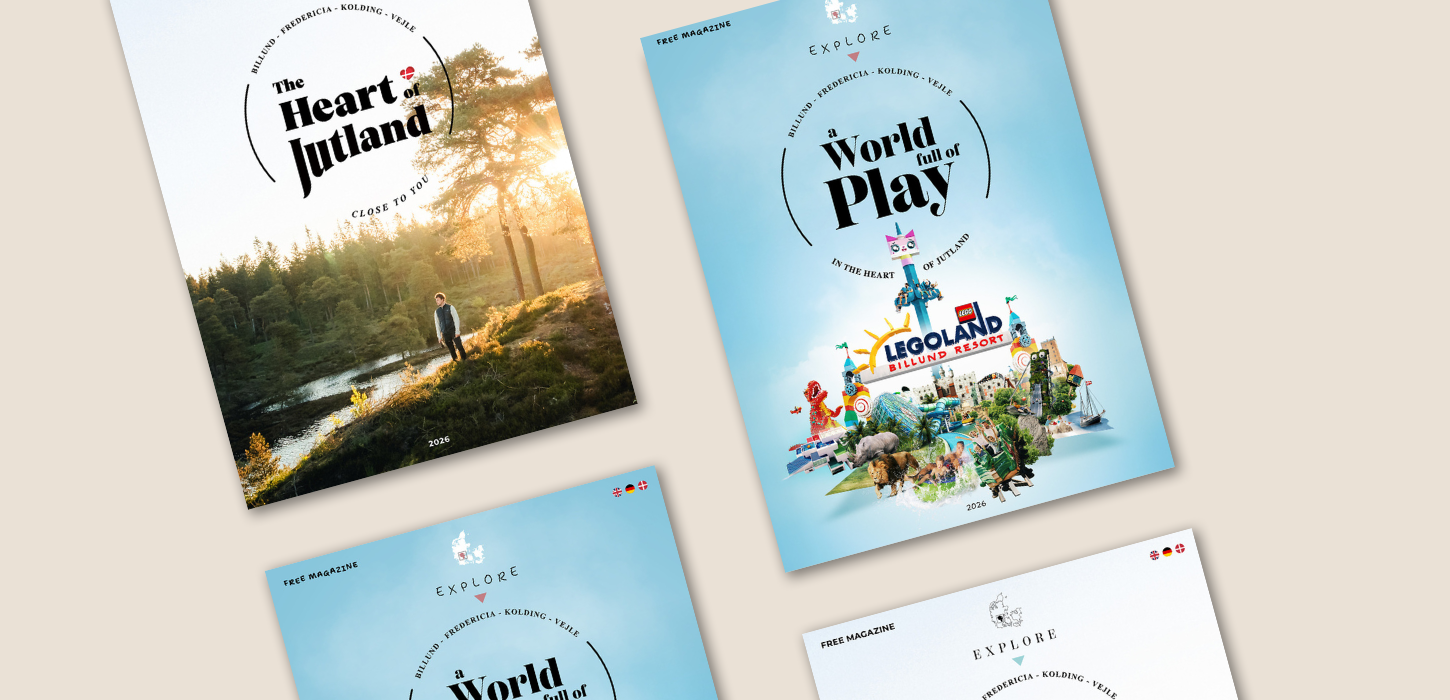 In the destination magazine “The Heart of Jutland”, you’ll find inspiration for your stay in Destination Trekantområdet in and around the four major cities of Vejle, Billund, Fredericia and Kolding. The guide is available in German, Danish and English and features two front covers – one aimed at adult guests and one at families with children.